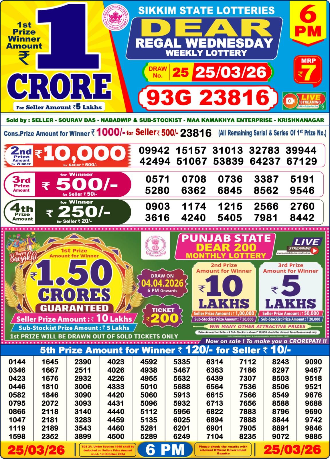 Dear Lottery Result Today Nagaland & Sikkim 1PM 6PM 8PM 25/03/2026