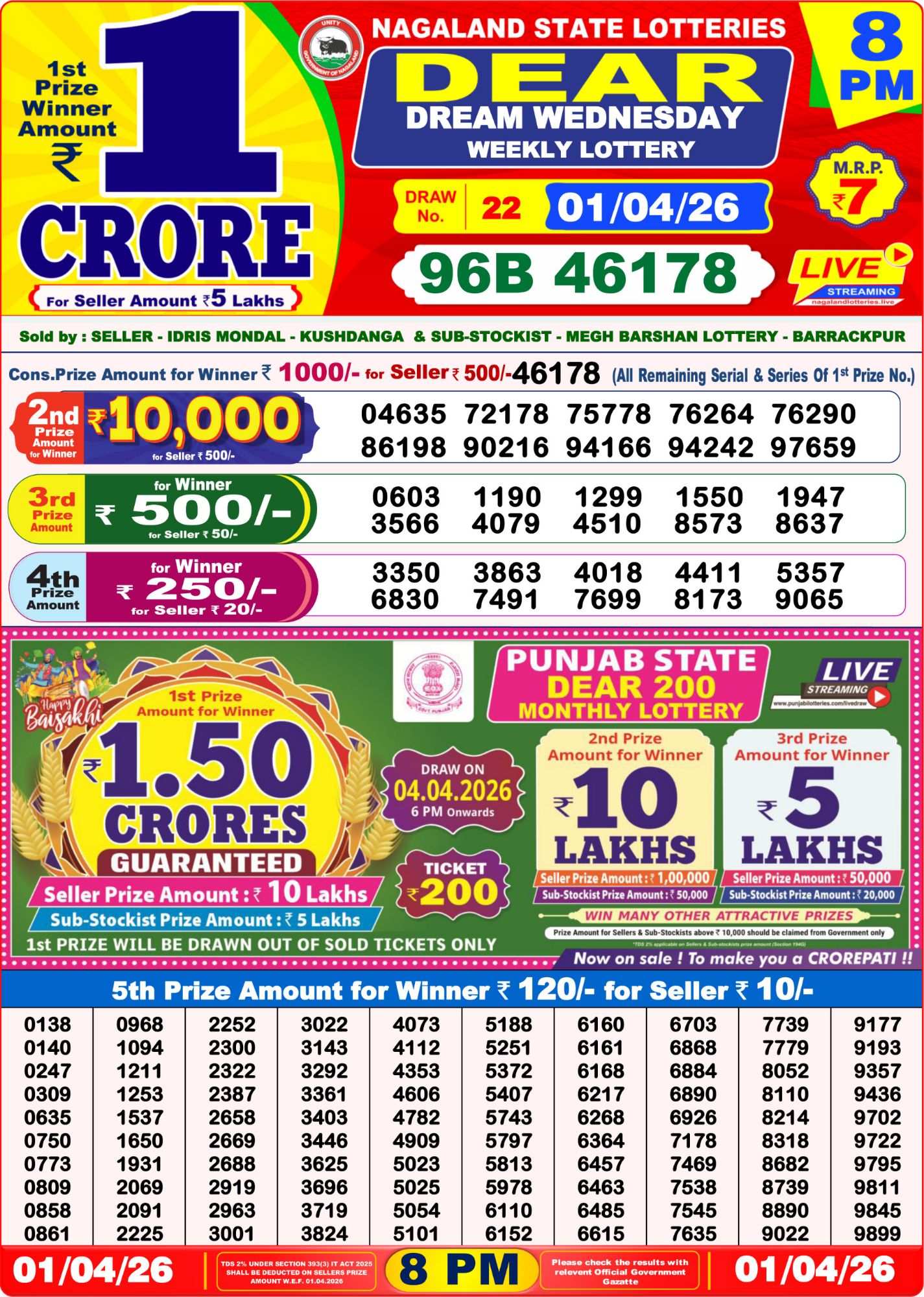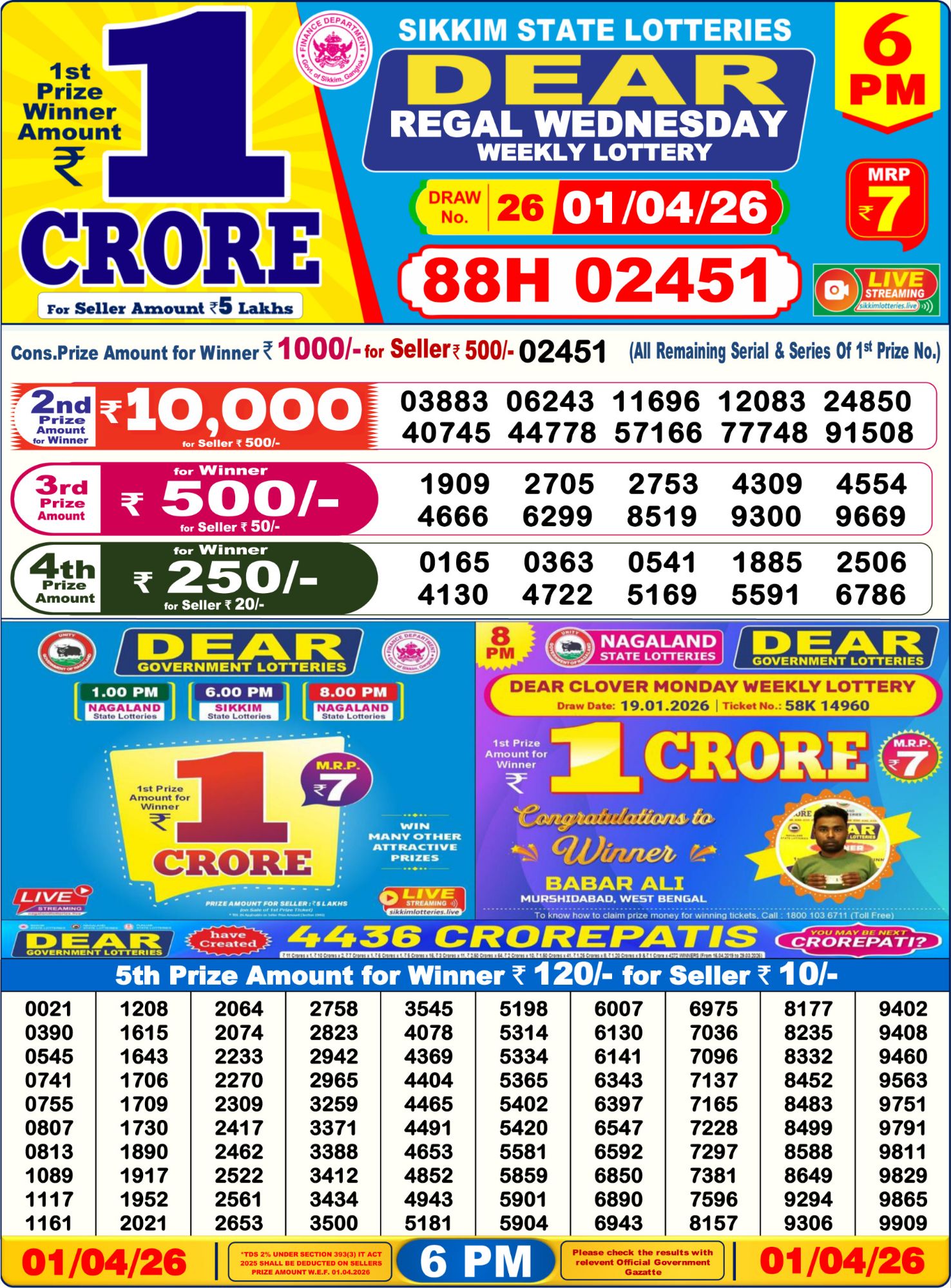 Dear Lottery Result Today Nagaland & Sikkim 1PM 6PM 8PM 01/04/2026
