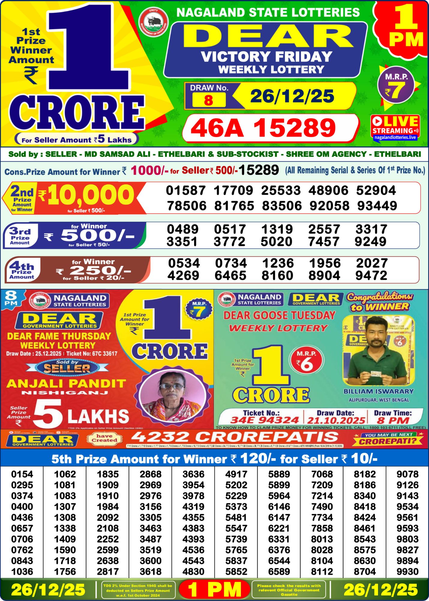 Next Result is 6 PM Draw & Today's draw is Dear Crown Weekly Lottery 26/12/25.