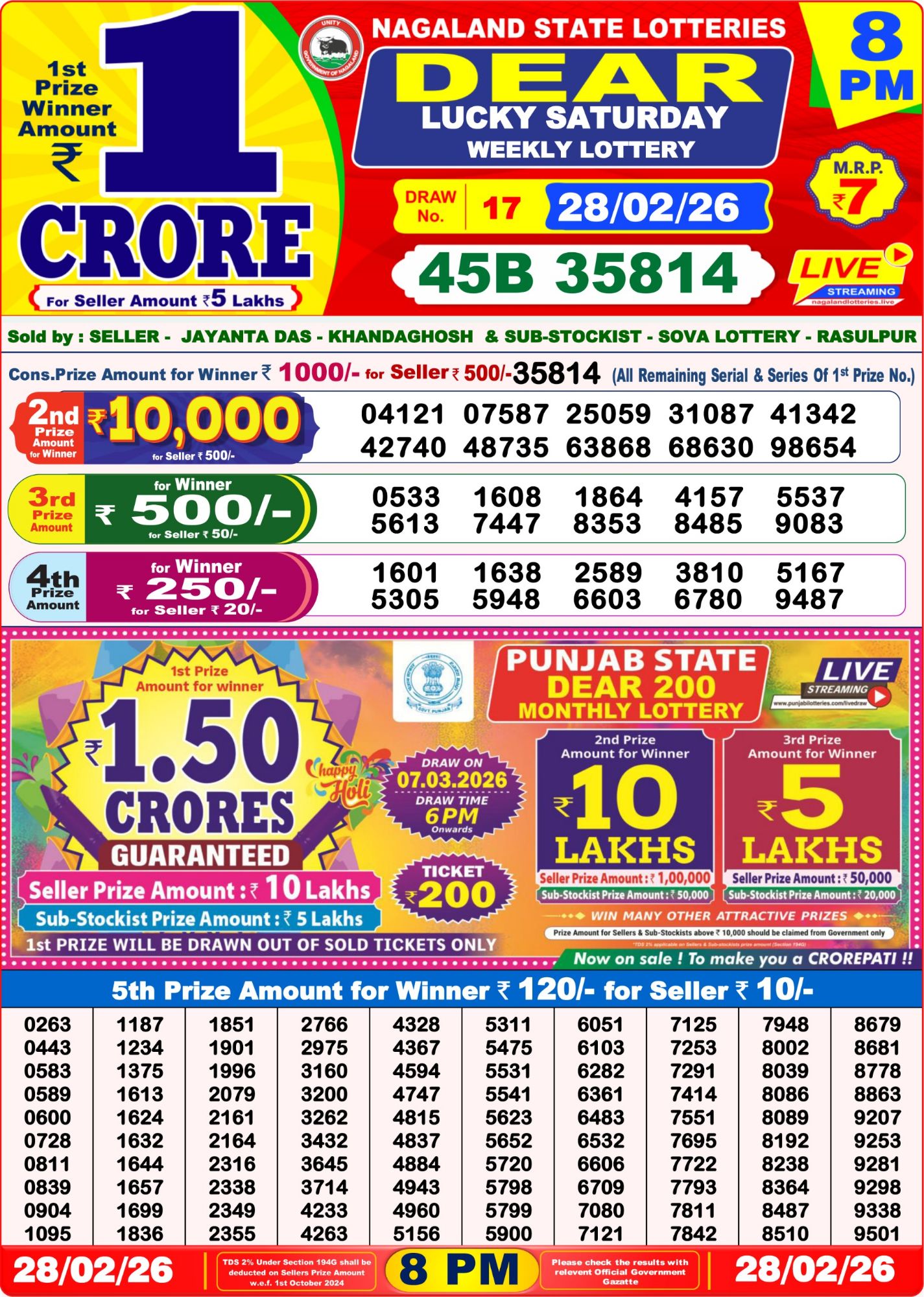 Result for 8 PM Dear Lucky Weekly Lottery for the Date 28/02/26 is published.